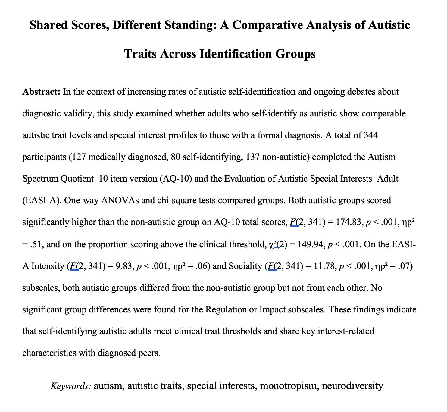 I just completed a quantitative research paper comparing autism traits in medically diagnosed autistic people with the same traits in self-identifying autistic people and I can definitively say with more stats behind it than I care to ever think about again, THERE IS NO DIFFERENCE! I have now made my study live as a bonus thank you gift for our paying supporters.