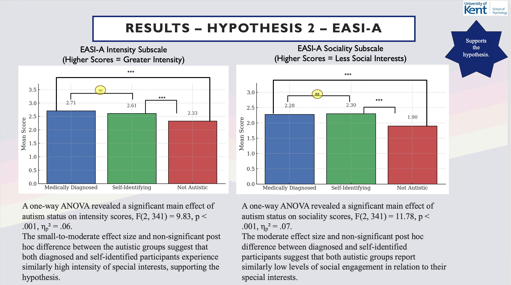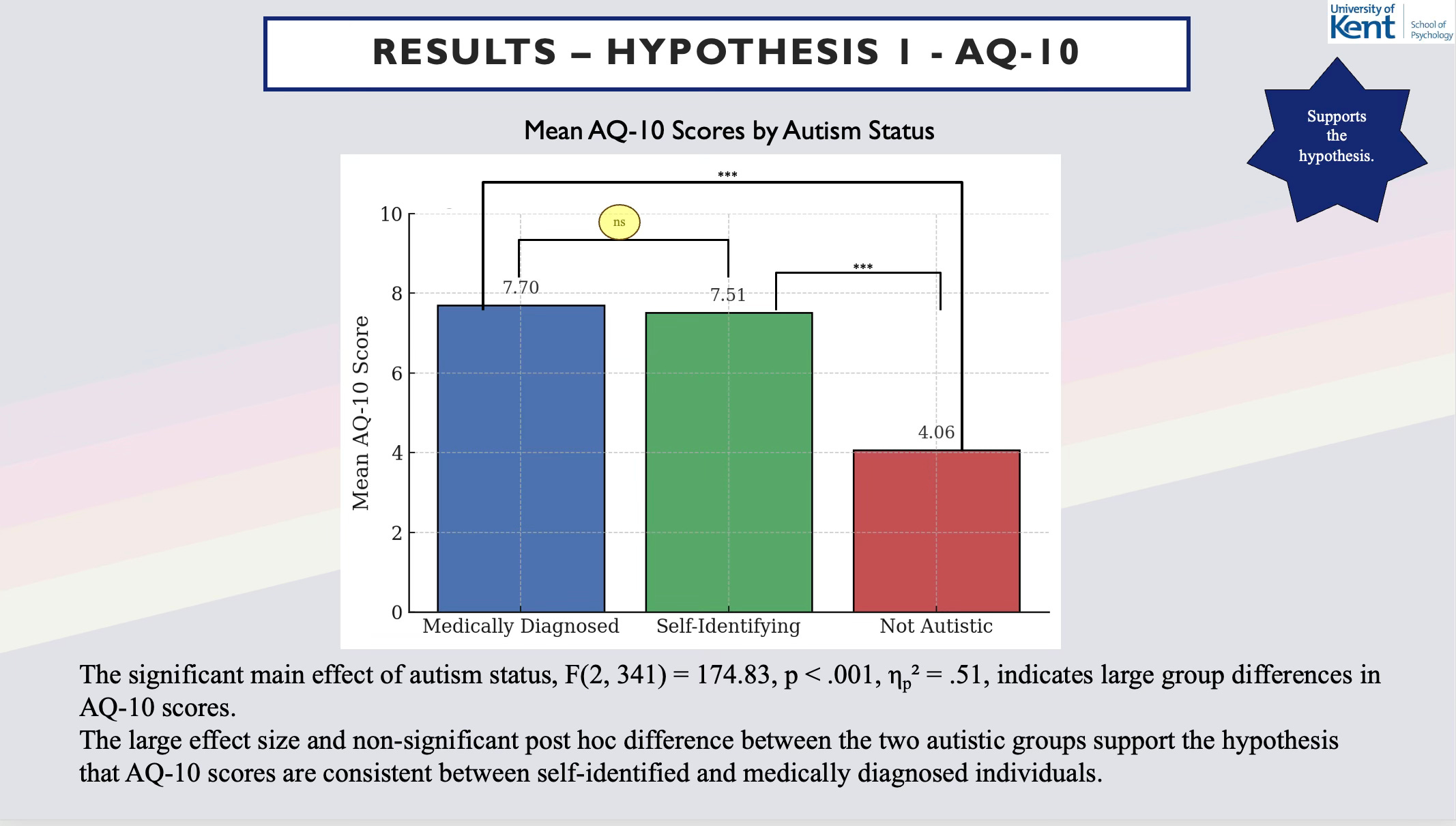 On the surface it looks like my dissertation is about comparing autistic trait levels between medically diagnosed and self diagnosed autistic people (with a non-autistic control group). That's true. I did that and quelle surprise! there is no statistical significance.