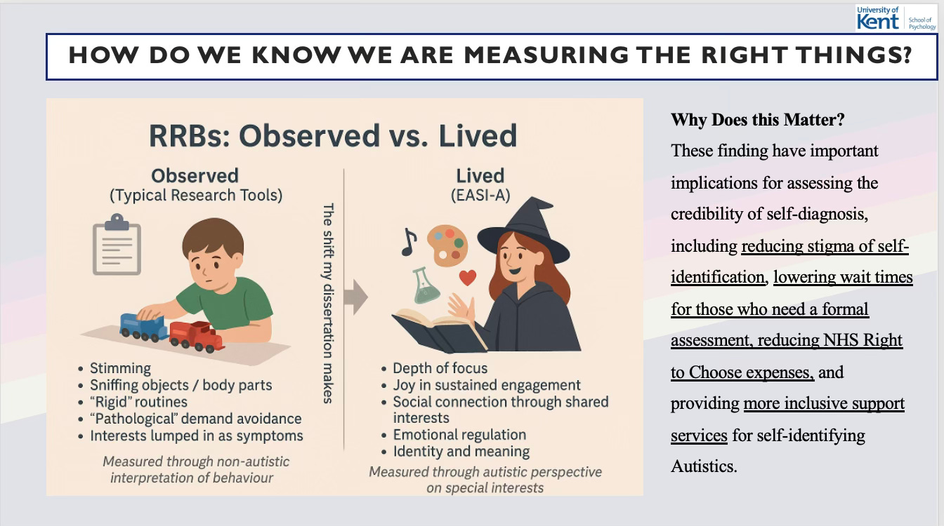 But part of criterion B includes special interests; and special interests are covered on the RBQ trait assessment measure (though it seems to confuse what an actual special interest is in some cases, but okay) and luckily there is a measure of special interests that is much more informed by actual autistic lived experience. That one is called the EASI-A. And here is where my subversion comes in. The revolutionary thing about my dissertation is I switch out the RBQ for the EASI-A as a way to measure RRBs as they’re lived, not as they’re observed.