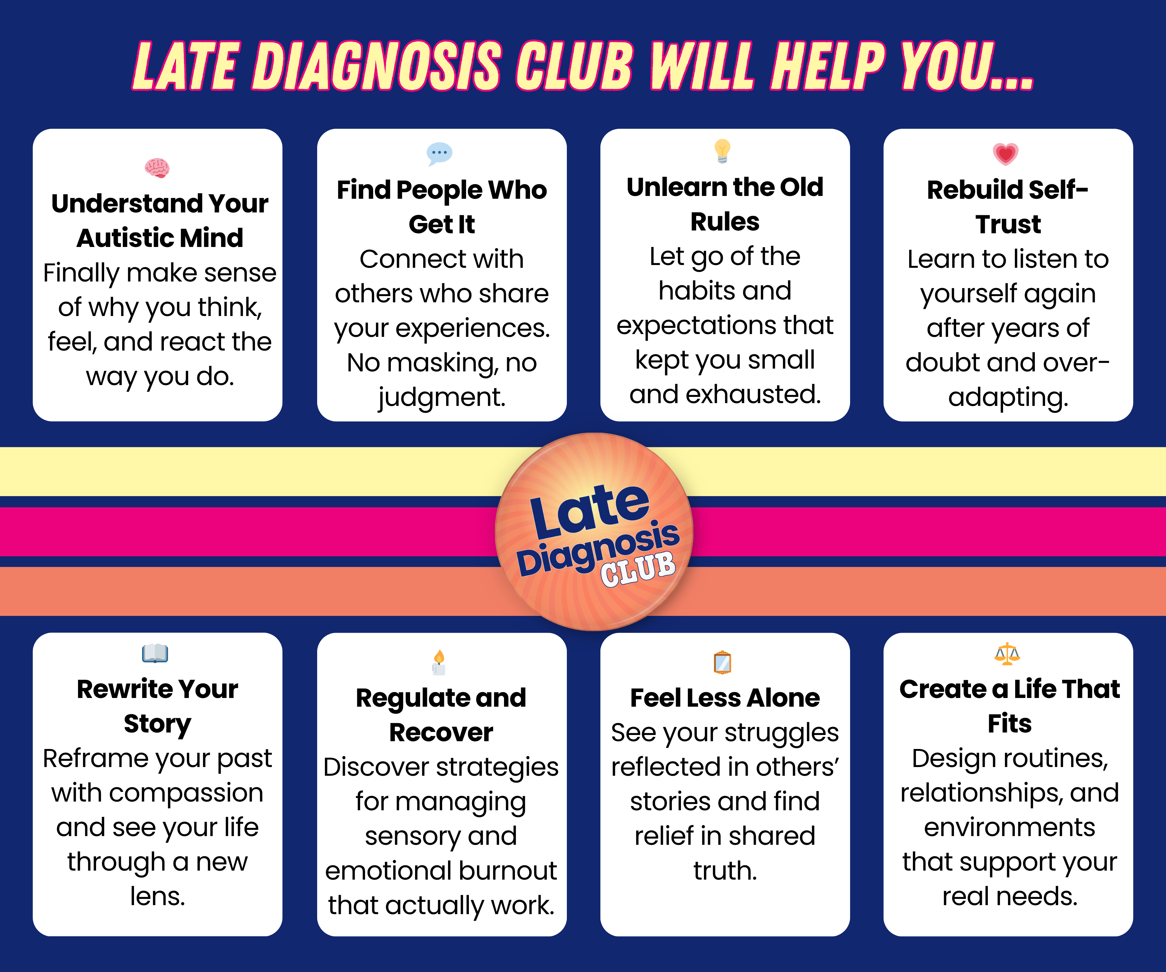 The Late Diagnosis Club is a membership community for late-diagnosed or self-identified neurodivergent adults who want to understand themselves, rebuild their identity, and belong somewhere without masking, explaining, or performing.