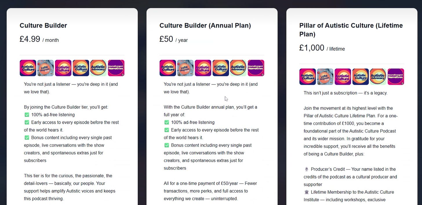 Choose your level — from monthly Culture Builder memberships to the lifetime Pillar of Autistic Culture tier — and get behind-the-scenes conversations, bonus episodes, and your name listed in the credits as part of our founding community.