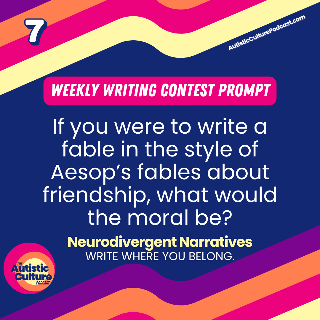 In Episode 142 of The Autistic Culture Podcast, Dr Angela Kingdon discusses the art of unmasking and how writing can help process late-diagnosis identity shock. Plus, she reveals this week’s creative prompt themed around the oral tradition of writing and sharing Fables! What lessons, values, or morals would you pass down as an Autistic person?