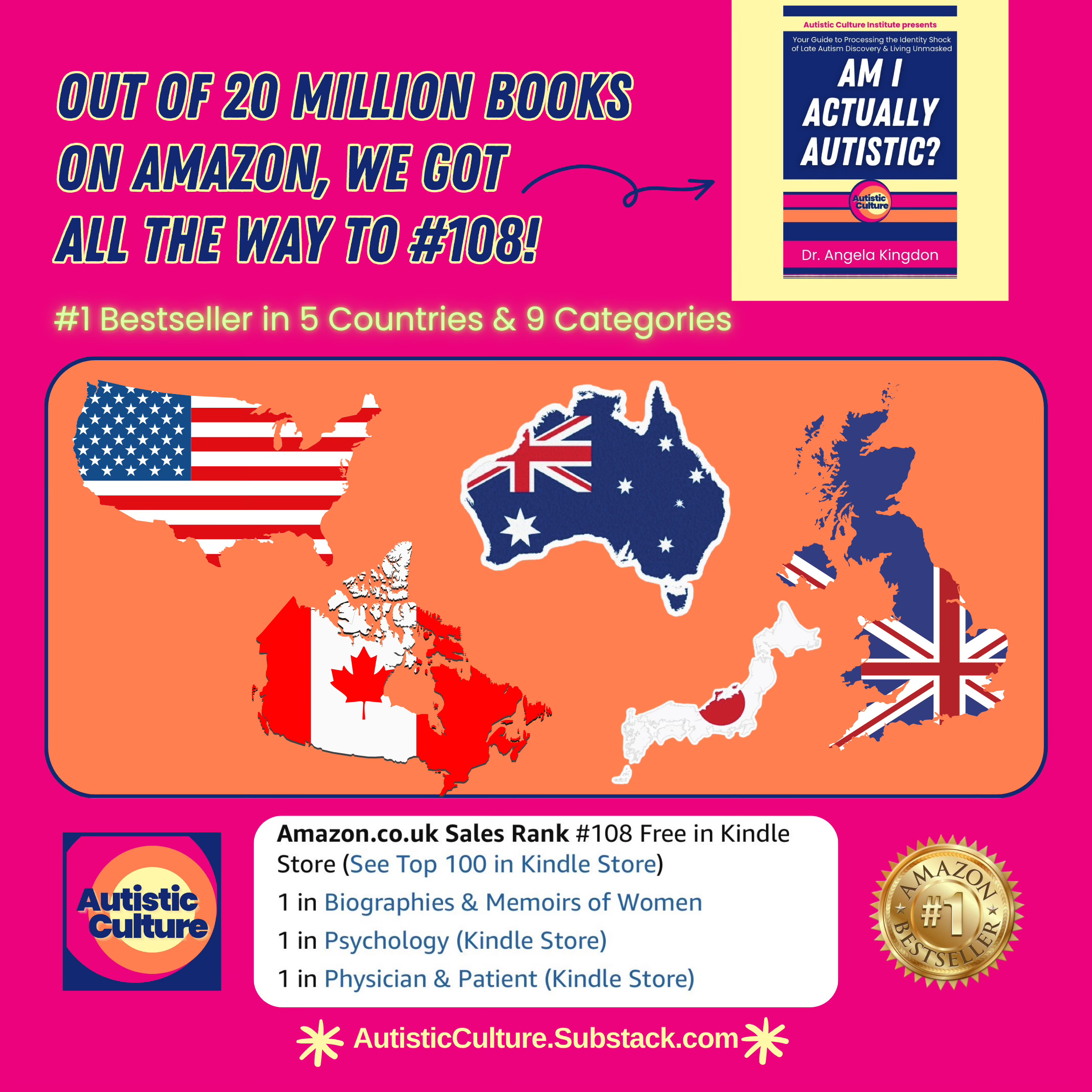 Launch week has officially finished! I am exhausted but completely in awe. Out of 20 million books on Amazon, Am I Actually Autistic? reached #108 overall and became a #1 bestseller in five countries and nine categories.