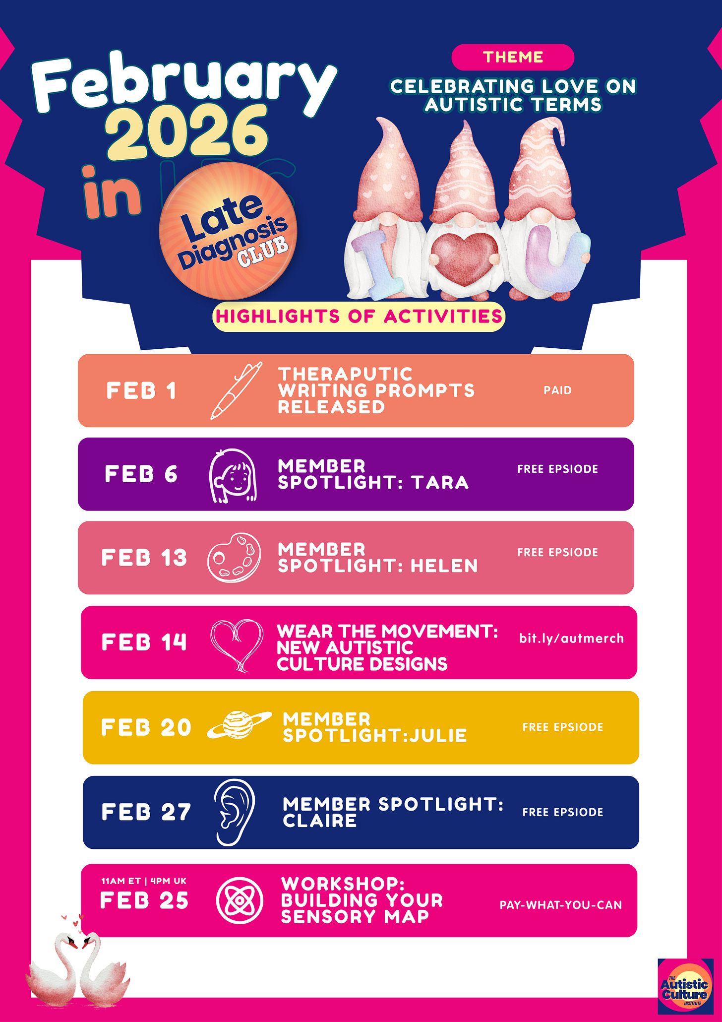 Get a free month of the Late Diagnosis Club if you buy our V-day merch and share your haul from the Autistic Culture Shop and be entered to win a free year. +Check out our February activity calendar!