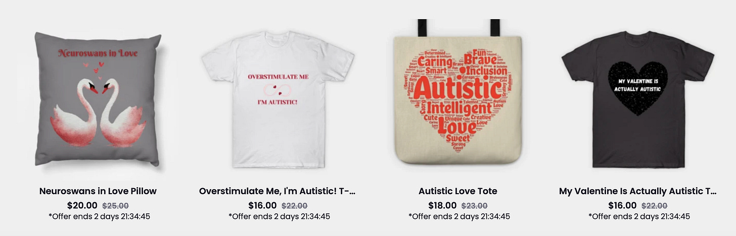 If Irish people wear Kiss Me I’m Irish shirts, how about an Overstimulate Me, I’m Autistic shirt? Are you and your partner(s) Neuroswans in Love? Celebrate it with this cute pillow. Let’s celebrate Autistic Love together. The Sale Details: